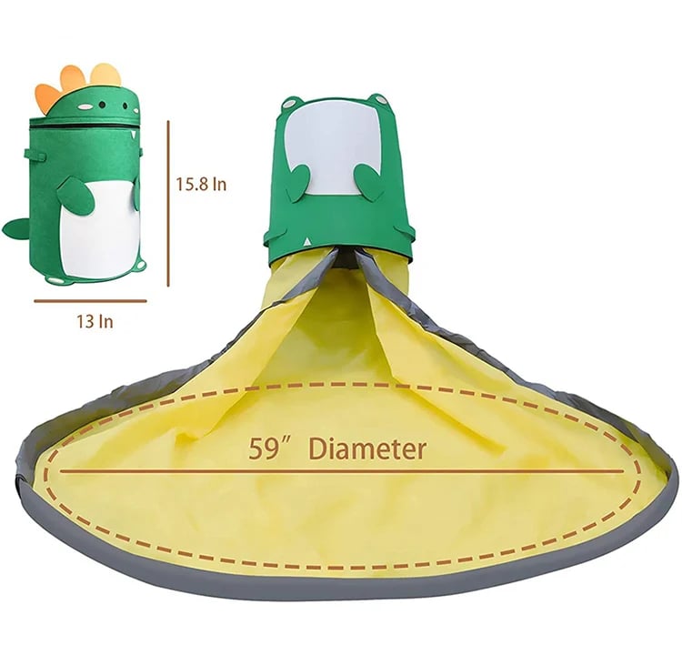 Toy storage bag with matching lid measures  15.8"/40cm tall with a 13"/33cm diameter. The attached 59"/149cm removable play mat keeps toys contained. It has ample space to store toys and play.